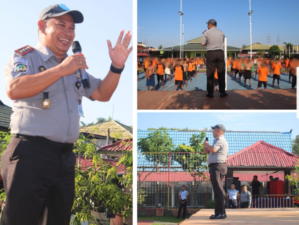 Kalapas Kelas IIA Banjarmasin, Akhmad Herriansyah, memberikan arahan langsung kepada warga binaan yang tengah bersiap melaksanakan senam pagi rutin di halaman dalam lapas, Selasa (29/07) pagi.