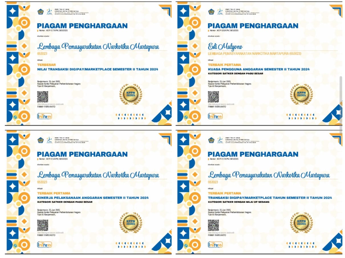 Piagam penghargaan diserahkan secara simbolis dan diumumkan setelah seluruh rangkaian rapat virtual yang diikuti oleh satuan kerja mitra KPPN Banjarmasin. Keempat penghargaan tersebut menjadi bukti nyata komitmen Lapas Narkotika Karang Intan dalam menjaga integritas, transparansi, dan akuntabilitas pengelolaan anggaran secara berkelanjutan.