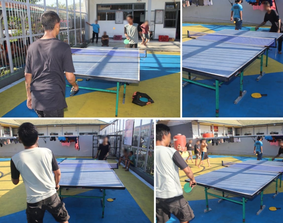 Dengan menggunakan perlengkapan sederhana, para warga binaan memainkan pertandingan tenis meja secara bergiliran. Kegiatan ini tidak hanya berfungsi sebagai sarana hiburan, tetapi juga memberikan dampak positif terhadap kondisi fisik dan psikologis warga binaan.