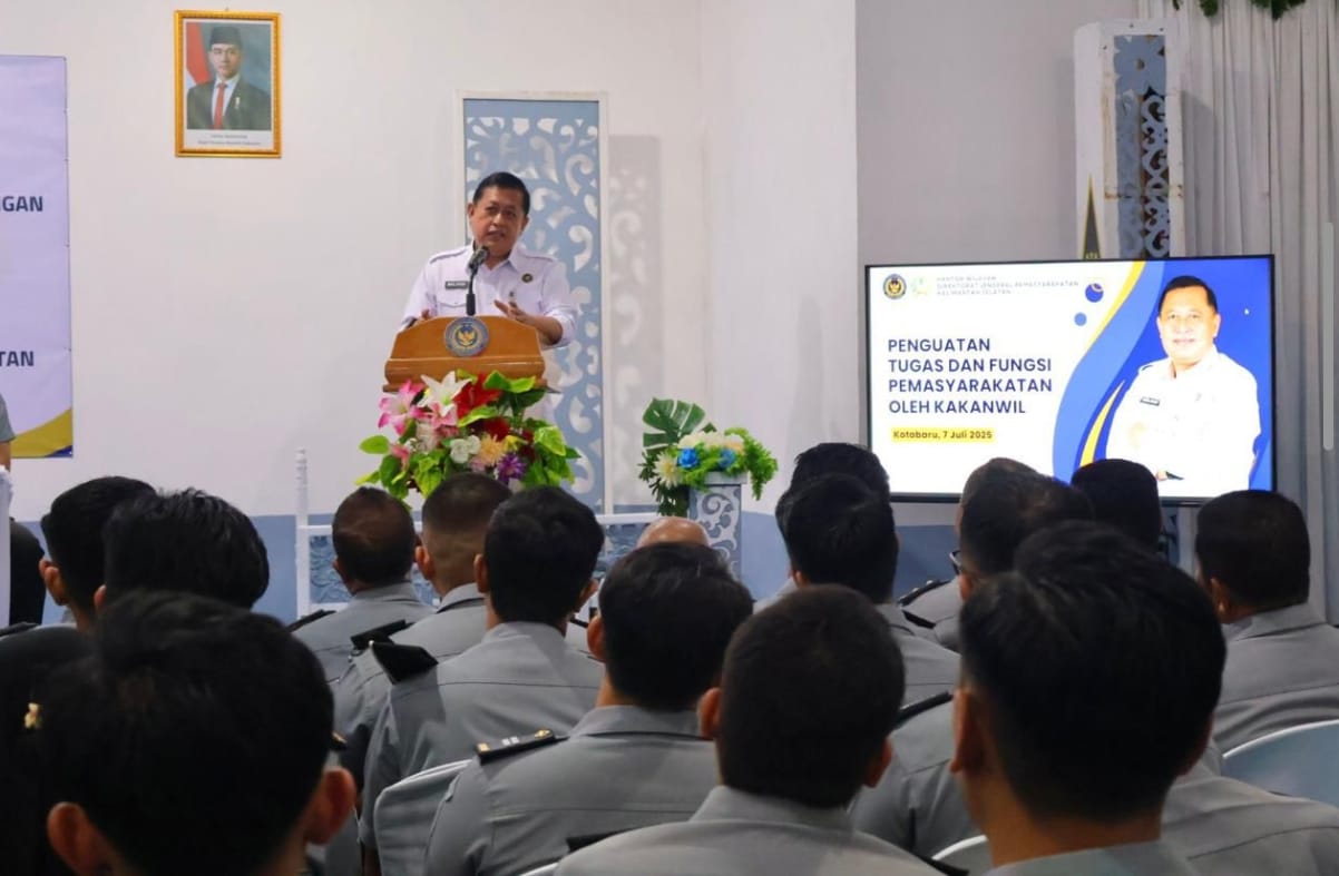 Kepala Kantor Wilayah (Kakanwil) Direktorat Jenderal Pemasyarakatan (Ditjenpas) Kalimantan Selatan, Mulyadi, berikan penguatan tugas pokok dan fungsi (tusi) bagi jajaran petugas Lembaga Pemasyarakatan (Lapas) Kelas IIA Kotabaru, Senin (7/7). Kakanwil sampaikan sejumlah arahan, khususnya mendukung 13 Program Akselerasi Menteri Imigrasi dan Pemasyarakatan, Agus Andrianto, antara lain: memberantas peredaran narkoba dan pelaku penipuan dengan berbagai modus di Lapas dan Rutan; memberdayakan warga binaan untuk mendukung ketahanan pangan; penguatan dan peningkatan pendayagunaan warga binaan untuk menghasilkan produk UMKM.
