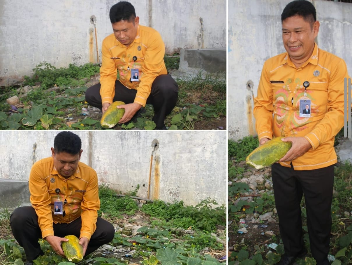 Tanaman timun suri atau yang dikenal dalam bahasa Banjar sebagai bilungka batu tampak tumbuh subur dengan beberapa buah yang sudah memasuki masa panen. Dalam kunjungan tersebut, Kalapas turut memetik langsung salah satu buah yang telah matang sebagai simbol apresiasi terhadap progres kegiatan pertanian ini.