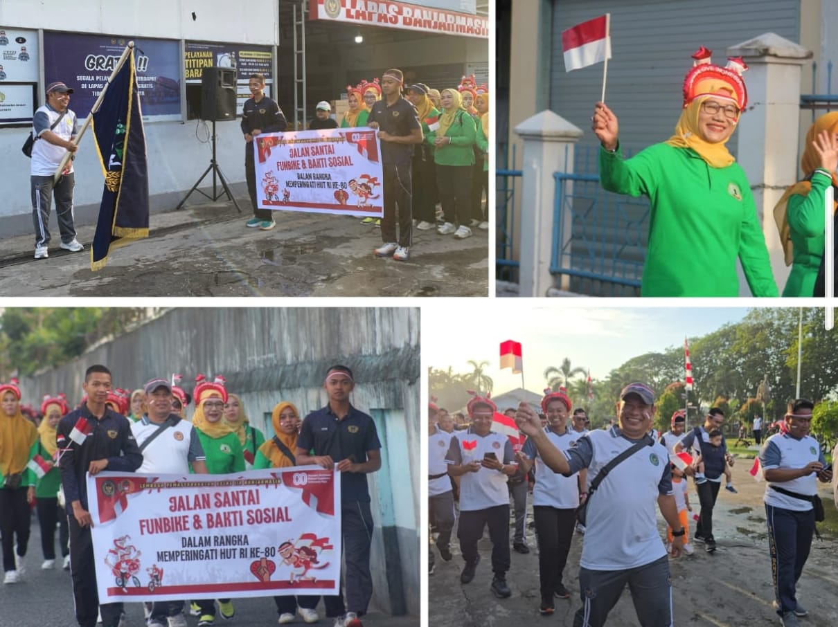 Kegiatan dibuka secara resmi oleh Kepala Lapas Kelas IIA Banjarmasin, Akhmad Herriansyah, yang turut hadir memberikan semangat kepada seluruh peserta. Jalan sehat dimulai dari halaman utama Lapas, mengelilingi rute di sekitar lingkungan Lapas Banjarmasin, dan kembali ke titik awal. Sorak-sorai peserta, atribut merah putih, serta canda tawa sepanjang perjalanan menambah suasana meriah.
