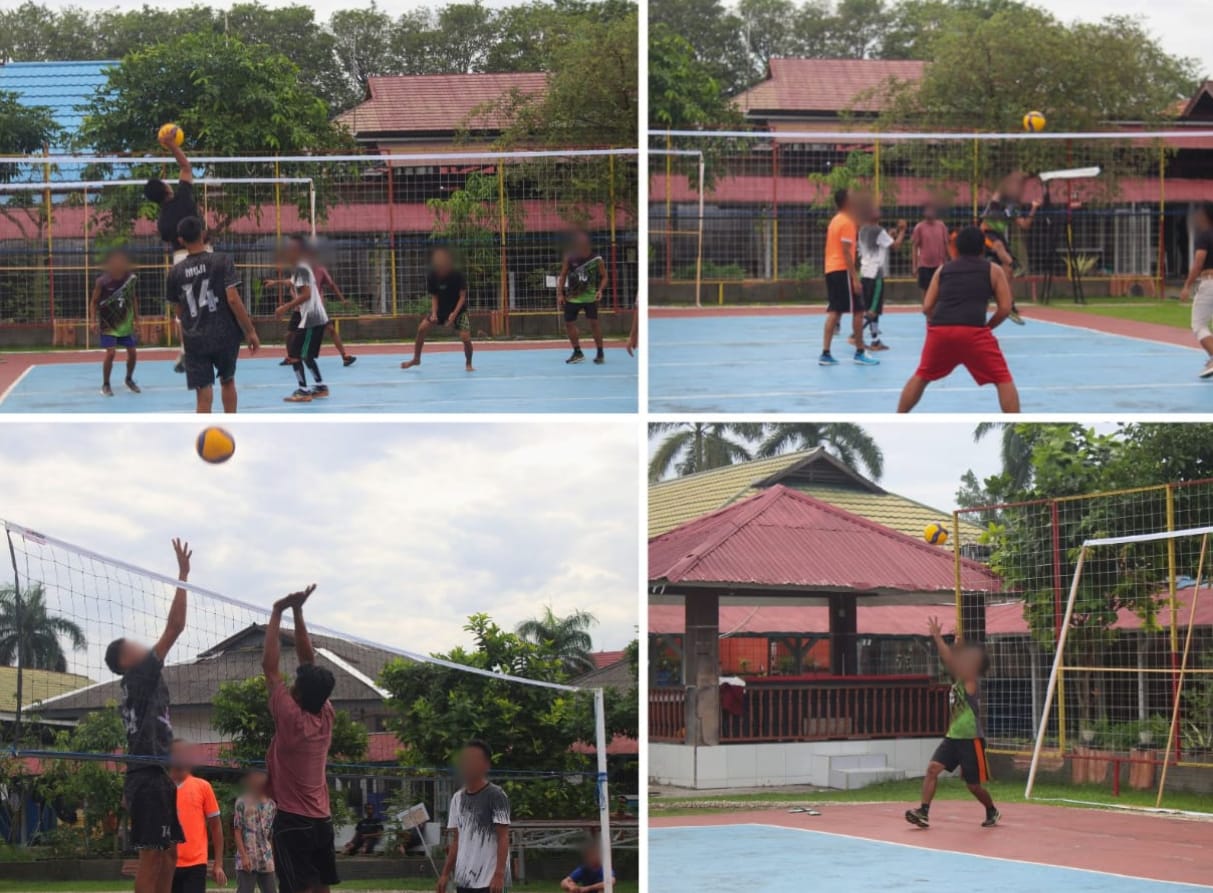 Warga Binaan Pemasyarakatan (WBP) Lapas Kelas IIA Banjarmasin mengisi waktu dengan kegiatan olahraga voli yang digelar di lapangan voli Lapas, Rabu (03/09) pagi pukul 08.30 WITA.