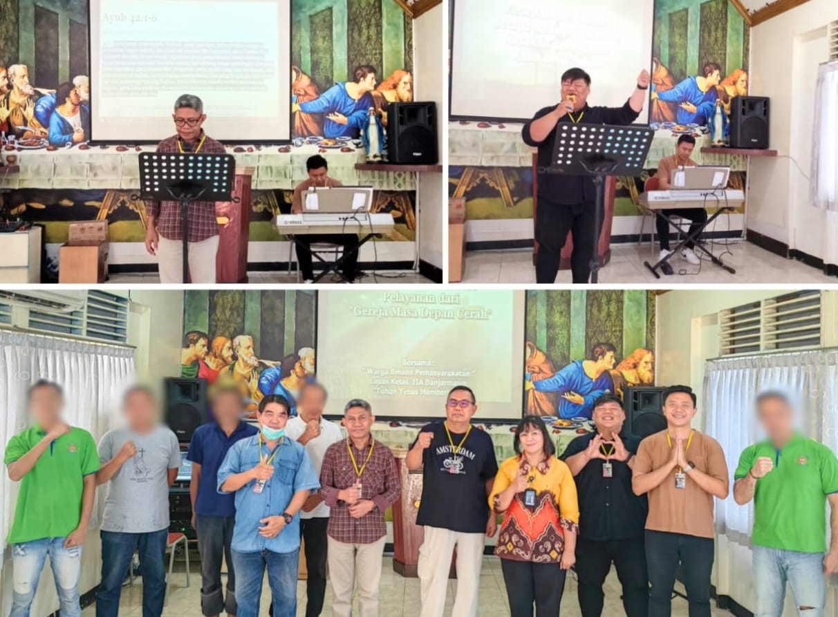 Kamis (04/09/2025), Warga Binaan Pemasyarakatan (WBP) Kristiani Lapas Kelas IIA Banjarmasin mengikuti ibadah rutin bulanan pelayanan dari Gereja Masa Depan Cerah (GMDC). Ibadah berlangsung di Gereja Oikumene Lapas dengan penuh khidmat, dihadiri oleh seluruh WBP Kristiani serta pembina gereja. Ibadah kali ini mengangkat tema dari Kitab Perjanjian Lama Ayub 42:1-6.