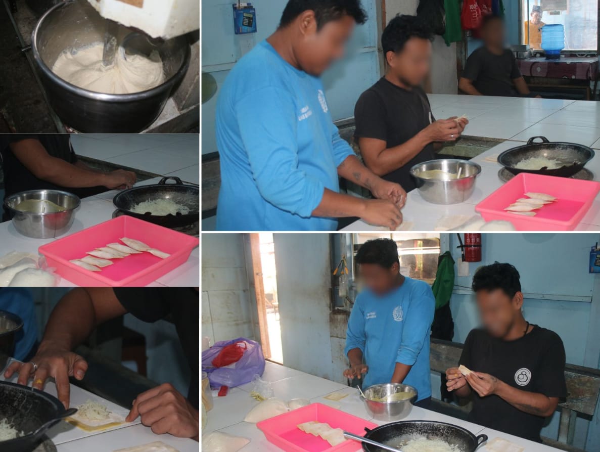 Senin (15/09) pagi, Program Kemandirian bagi warga binaan kembali menghadirkan suasana hangat di bangker Lapas Banjarmasin. Subhan dan Adhami menunjukkan kreativitasnya dengan membuat martabak mini, memanfaatkan bahan sederhana seperti mi, kulit pangsit, dan telur.