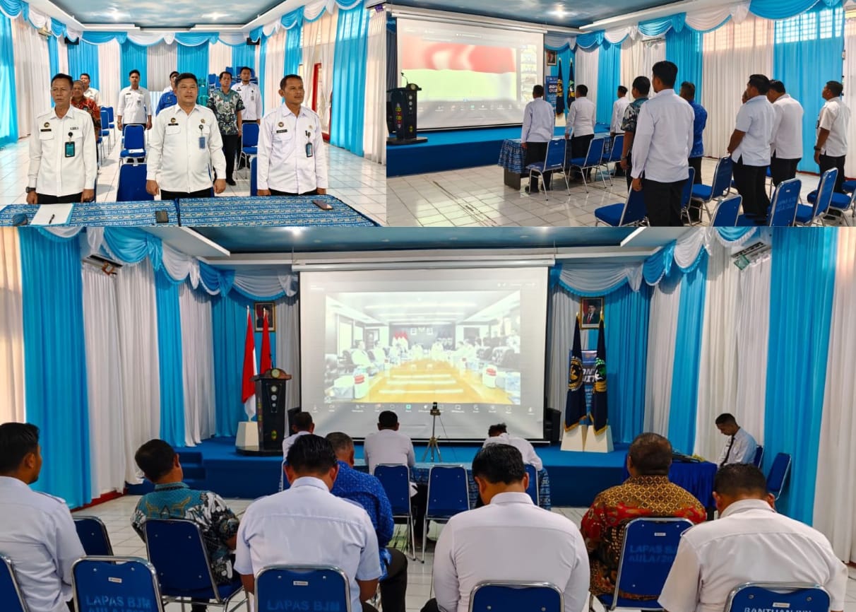 Kepala Lapas Kelas IIA Banjarmasin, Akhmad Herriansyah, bersama jajaran struktural, mengikuti Rapat Nasional Kementerian Imigrasi dan Pemasyarakatan (Kemenimipas) yang dilaksanakan secara virtual melalui Zoom Meeting di Aula Lapas Banjarmasin, Kamis (16/10).