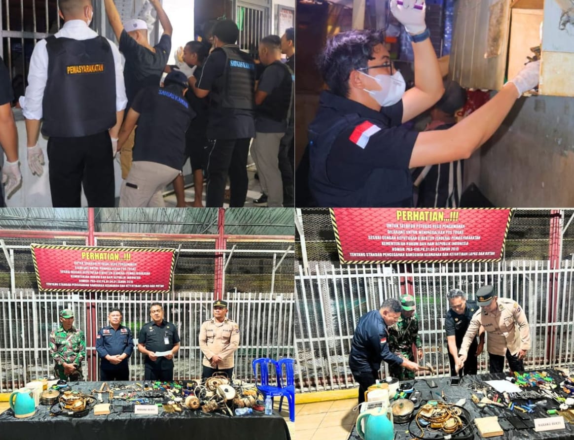 2 unit HP, 6 senjata tajam, 84 korek api gas, 6 charger HP, 8 terminal rakitan, 2 botol parfum kaca, 1 vape, 2 baterai, 1 alat cukur, 1 mic, 7 headset, 1 gunting, 22 sendok besi, 30 batang besi, 2 pemotong kuku, 7 cukuran jenggot, 3 modem WiFi, 5 case HP, 8 panci elektrik, dan 2 speaker wireless.