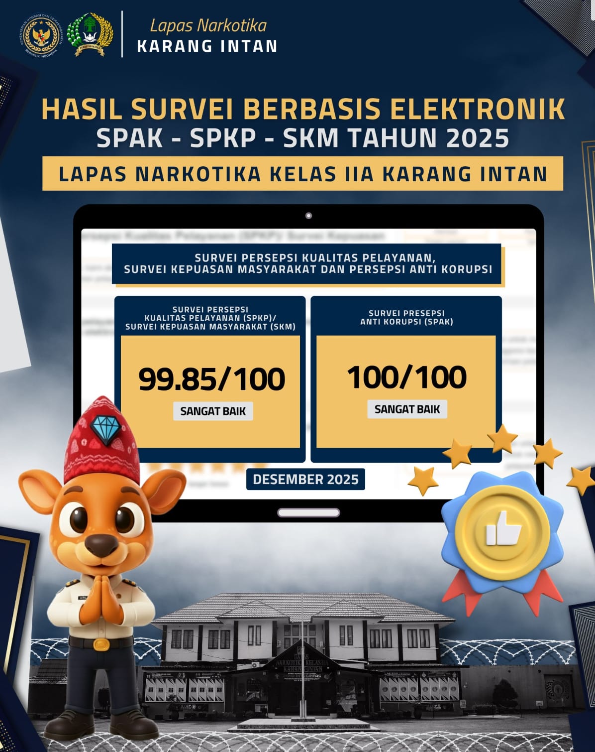 Survei Persepsi Kualitas Pelayanan, Survei Kepuasan Masyarakat dan Persepsi anti Korupsi Kementerian Imigrasi Dan Pemasyarakatan Lembaga Pemasyarakatan Narkotika Kelas IIA Karang Intan, pada Triwulan IV bulan Oktober, November dan Desember Tahun 2025 menggambarkan hasil memuaskan dengan Predikat Sangat Baik.
