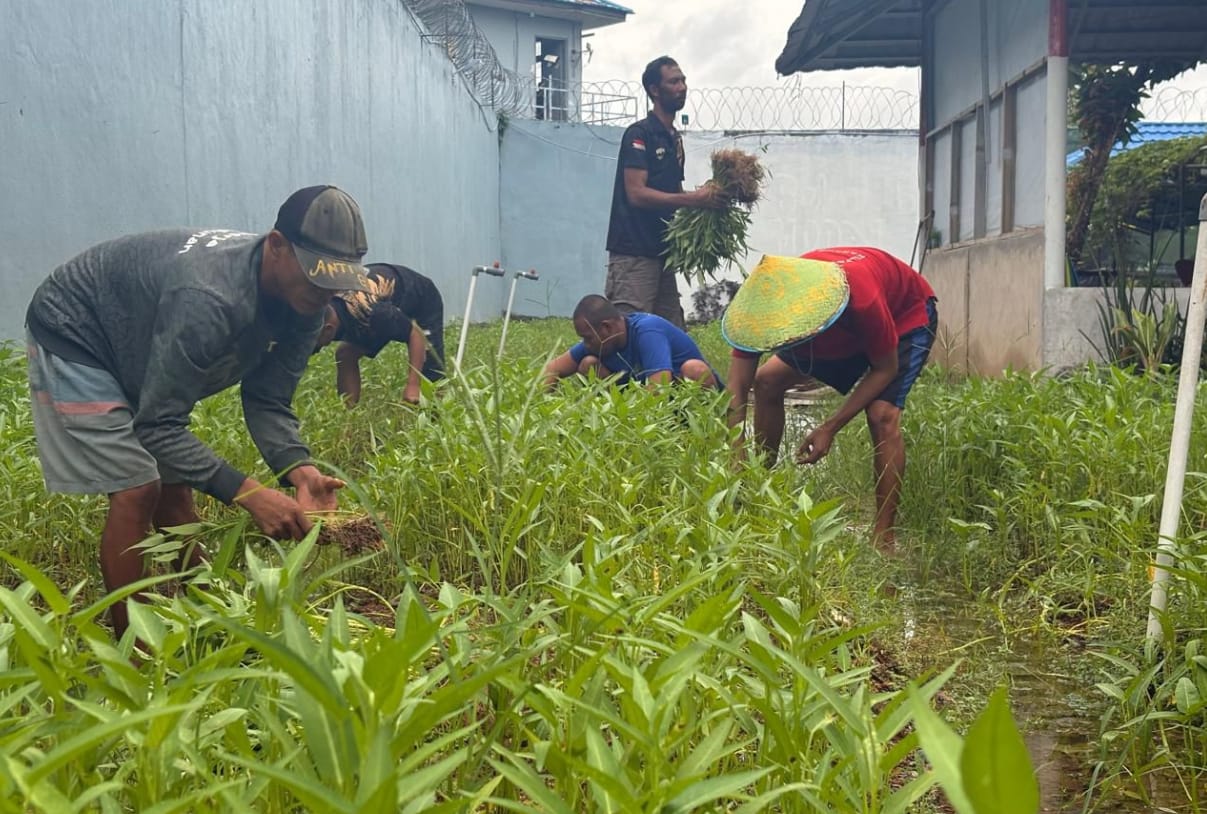 Keberhasilan pembinaan kemandirian bagi Warga Binaan di Lembaga Pemasyarakatan (Lapas) Narkotika Kelas IIA Karang Intan kembali ditunjukkan melalui panen 100 kilogram kangkung, Senin (5/1). Panen ini dilaksanakan langsung oleh Kepala Lapas Narkotika Karang Intan bersama Kepala Seksi Kegiatan Kerja (Kasi Giatja) serta Kepala Subseksi Bimbingan Kerja dan Pengelolaan Hasil Kerja (Kasubsi Bimker Lohasker), sebagai wujud dukungan terhadap program pembinaan produktif di dalam lapas.