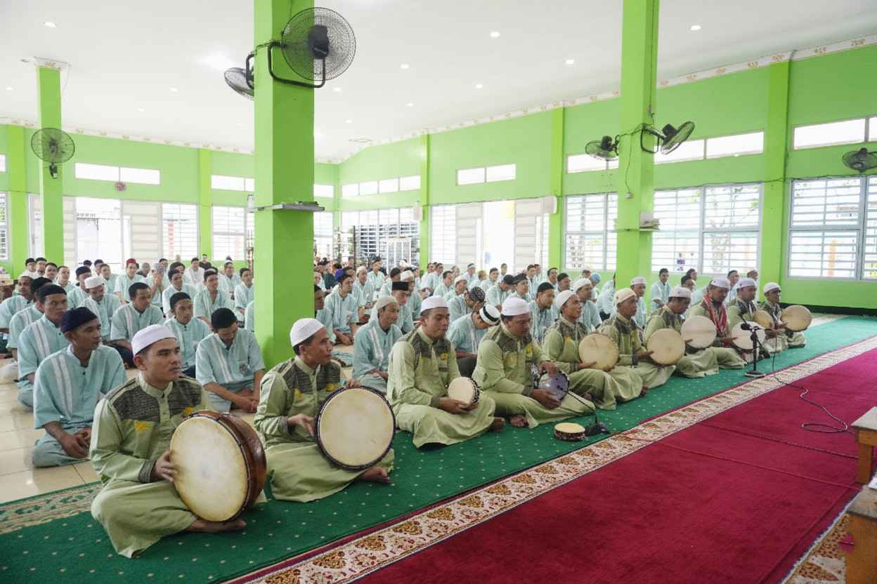 Suasana penuh berkah bulan suci Ramadan 1447 Hijriah, ratusan santri Warga Binaan Lapas Narkotika Kelas IIA Karang Intan memadati Masjid At-Taubah Masjid At-Taubah, Senin (23/02/2026). Dengan penuh kekhusyukan, mereka melantunkan sholawat kepada Nabi Muhammad SAW yang diiringi tabuhan rebana grup habsyi internal Lapas.